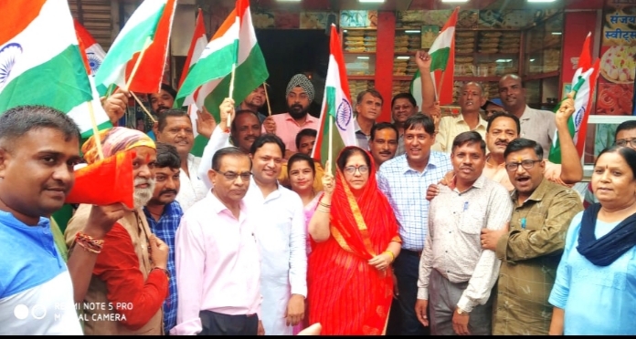आजादी अमृत महोत्सव पर व्यापारी प्रकोष्ठ द्वारा दुकानों पर तिरंगा लगाया गया