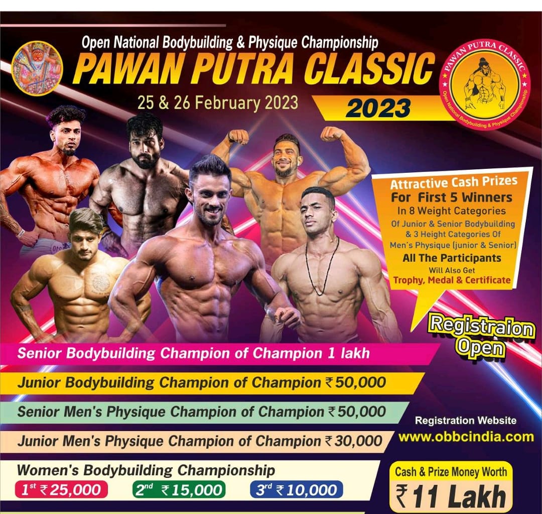 समिति सदस्य झेन चंदेरी तथा तिलक सेन ने बताया कि स्पर्धा के समस्त सहभागी खिलाड़ियों को शानदार मैडल, ट्रॉफी और सर्टिफिकेट निश्चित तौर पर प्राप्त होंगे, साथ ही सभी विजेता खिलाड़ियों को शानदार नगद पुरस्कार राशि तथा चैंपियन ट्रॉफी भी प्राप्त होगी। आयोजन समिति सदस्य महेश विश्वकर्मा, केशव भव तथा डॉ. आबिद खान ने बताया कि पवन पुत्र क्लासिक खिताब के लिए नैशनल चैम्पियनशिप में फिजिक स्पर्धा भी आयोजित की गई हैं जो पुरुष वर्ग में जुनियर तथा सीनियर स्तर पर होकर तीन हाइट वर्ग में रखी गई हैं। जबकि महिला ओपन वर्ग में बॉडी बिल्डिंग तथा फिजिक माडल प्रतियोगिता होना हैं। कार्यक्रम विवरण अनुसार 25 फरवरी शनिवार 2023 को जूनियर बॉडीबिल्डिंग चैंपियनशिप, जूनियर चैंपियन आॅफ चैंपियन, जूनियर फिजिक चैंपियनशिप और वूमेन बॉडी बिल्डिंग तथा फिजिक स्पोर्ट्स चैंपियनशिप होगी। सह आयोजक आकाश आर्य तथा गुलाम बाबा ने बताया कि स्पर्धा वाले दिन भी दोपहर 1 बजे तक फतेह क्लब मैदान पर खिलाड़ी इंट्री कर इसमें भाग ले सकते हैं। समिति सदस्य श्याम मेलाना और दीप शाह स्पर्धा में शामिल सभी खिलाड़ियों के रुकने तथा भोजन की उत्तम व्यवस्था में लगे हैं। उपरोक्त जानकारी समिति प्रवक्ता आशुतोष पंचोली ने प्रेस विज्ञप्ति जारी कर दी है।