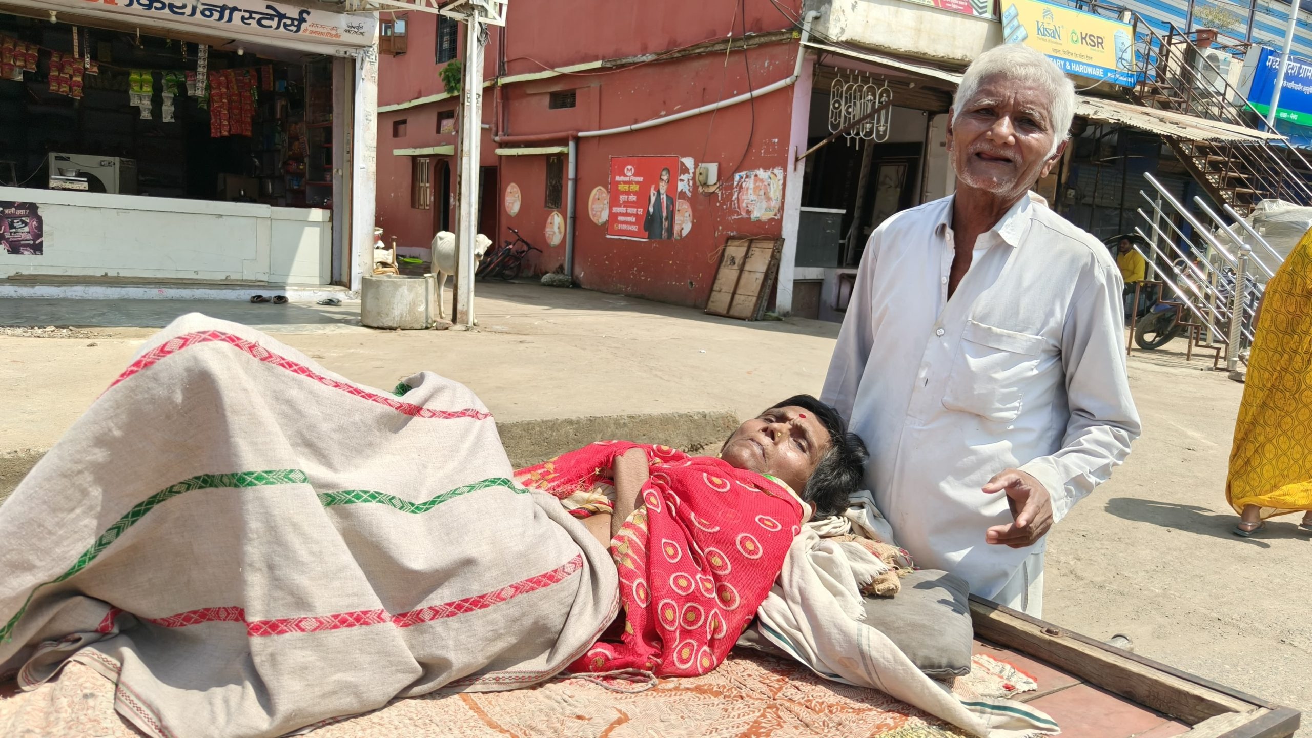 सीहोर जिले के भैरूंदा नगर में एक ऐसी तस्वीर सामने आई, जो अंदर से झकझोर कर देने वाली है। दरअसल नगर के एक बुजुर्ग अपनी लकवाग्रस्त पत्नी को हाथ ठेले पर लेटाकर ठेला धकाते हुए बैंक पहुंचे। यहां पर वे तीन महीने की पेंशन लेने के लिए पहुंचे थे। कुंआर माह की पड़ती तीखी धूप में दिखी यह तस्वीर कहीं न कहीं इंसानियत को भी शर्मशार कर देने वाली है।