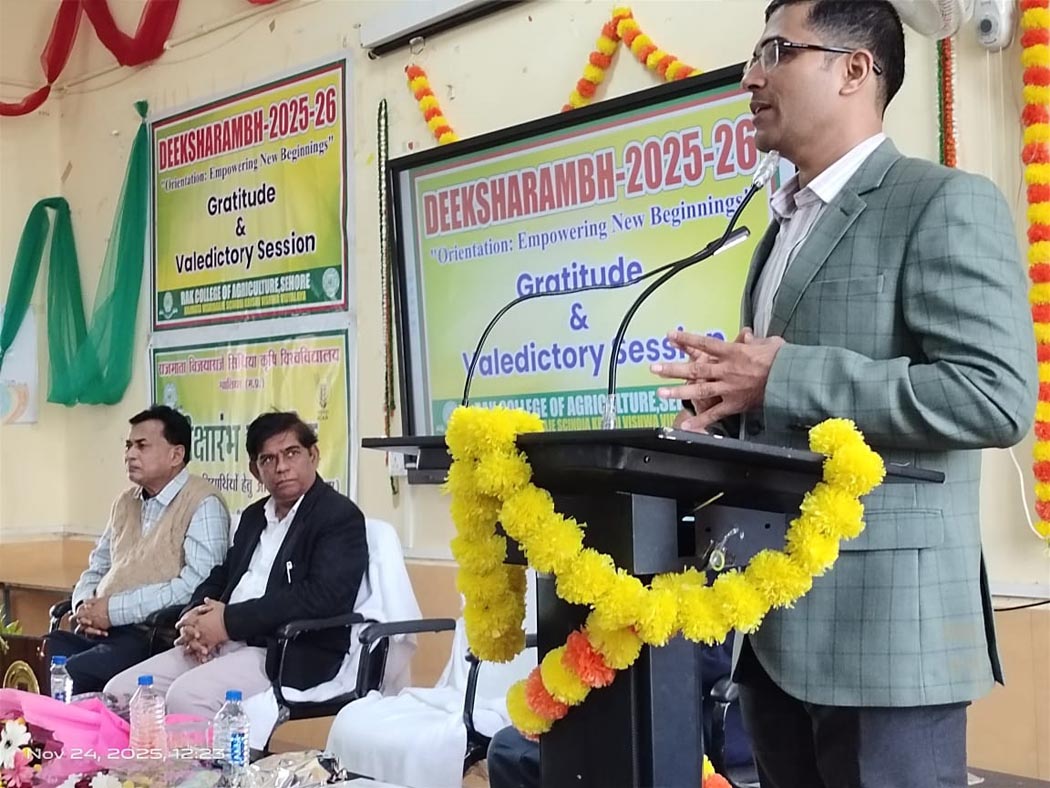 सीहोर। आरएके कृषि महाविद्यालय में प्रथम वर्ष के नवप्रवेशी छात्र-छात्राओं के लिए आयोजित दीक्षारंभ समारोह में मुख्य अतिथि के रूप में पुलिस अधीक्षक दीपक कुमार शुक्ला ने विद्यार्थियों को संबोधित किया। अपने उद्बोधन में उन्होंने नशामुक्ति, महिला सुरक्षा, साइबर फ्रॉड और सडक़ सुरक्षा जैसे महत्वपूर्ण विषयों पर विस्तार से चर्चा करते हुए छात्रों को जागरूक किया.