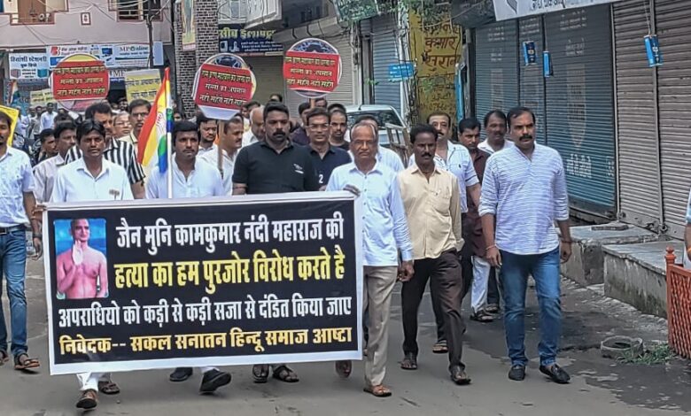 आष्टा। विगत दिवस कर्नाटक के बेलगावी जिले में हुए दिगम्बर जैन मुनि कामकुमार नंदी महाराज की नृशंस हत्या के विरोध में आष्टा सकल दिगम्बर-श्वेताम्बर जैन समाज के व्यापारियों ने दोपहर 1 बजे तक अपने-अपने व्यापारिक प्रतिष्ठान पूर्णतः बंद रखकर उक्त घटना को लेकर कड़ा विरोध दर्ज कराया। श्री दिगम्बर जैन समाज के अध्यक्ष आनन्द जैन पोरवाल, श्री श्वेताम्बर जैन श्रीसंघ के अध्यक्ष पवन सुराणा के नेतृत्व में भवानी चौक से सकल हिन्दू समाज की मौन रैली निकाली गई, जो नगर के प्रमुख मार्गों से होते हुए बड़ा बाजार में समाप्त हुई। बड़ा बाजार में रैली को विहिप नेता गोपालदास राठी, व्यापार महासंघ अध्यक्ष रूपेश राठौर, श्वेताम्बर जैन श्रीसंघ के अध्यक्ष पवन सुरणा ने संबोधित कर उक्त घटना के दोषियों को कड़ी से कड़ी सजा की मांग की एवं केंद्र एवं सभी राज्य सरकारों से मांग की कि जैन साधु जो कि पैदल ही बिहार करते हैं उनकी पर्याप्त सुरक्षा सुनिश्चित हो। संचालन सुरेन्द्र जैन ने तथा आभार कैलाश जैन ने व्यक्त किया। उक्त दुखद घटना की सकल जैन समाज आष्टा ने कटु निंदा की है तथा हत्या के अपराधियों को कठोर दंड दिए जाने के साथ ही देशभर में जैन मुनियों की सुरक्षा के पुख्ता इंतजाम किए जाने की मांग सरकार से की है। जैन संत समूर्ण भारत वर्ष में पैदल ही विहार करते हैं, उन्हें सुरक्षा प्रदान करना सरकार की नैतिक जिम्मेदारी है। बन्द का व्यापार महासंघ ने भी समर्थन किया था, लेकिन अन्य सभी व्यापारियों की दुकानें आंशिक रूप से बंद नजर आई। आयोजित मौन रैली में सैकड़ों सकल हिन्दू समाज के नागरिक हाथों में तख्तियां लिए शामिल थे तथा हाथों पर काली पट्टियां बांधे थे।