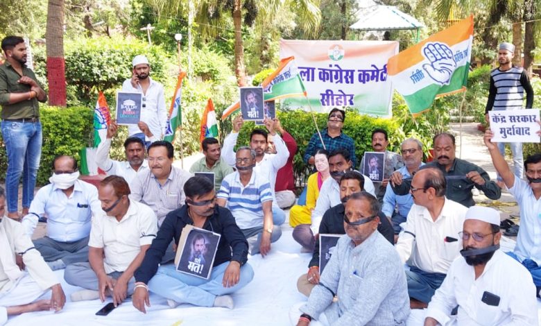 सीहोर: कांग्रेस ने किया काली पट्टी बांधकर मौनधारण, केंद्र सरकार का जलाया पुतला