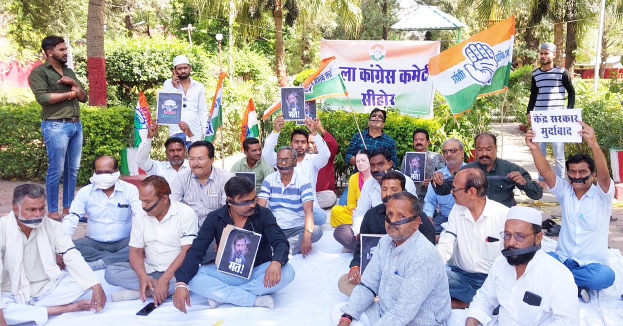 सीहोर: कांग्रेस ने किया काली पट्टी बांधकर मौनधारण, केंद्र सरकार का जलाया पुतला