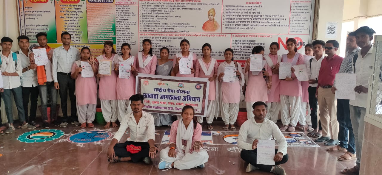 रेहटी। शासकीय महाविद्यालय रेहटी की राष्ट्रीय सेवा योजना इकाई एवं नगर परिषद रेहटी द्वारा लोकसभा निर्वाचन 2024 के तहत मतदाता जागरूकता अभियान कार्यक्रम का आयोजन महाविद्यालय परिसर में प्राचार्य डॉ अंजली गढ़वाल के संरक्षण में किया गया। राष्ट्रीय सेवा योजना के कार्यक्रम अधिकारी डॉ पुनीत कुमार मालवी एवं सहायक डॉ दीपक रजने के निर्देशन में मतदाता जागरूकता के लिए स्लोगन रंगोली एवं मेहंदी प्रतियोगिता कराई गई। इस प्रतियोगिता में स्वीप प्लान के प्रभारी राजाराम रावते एवं केंपस एम्बेसडर शेखर पैठारी के सहयोग से स्वयंसेवकों ने बड़े उत्साह के साथ प्रतियोगिता में भाग लेकर रंगोली मेहंदी बनाई तथा स्लोगन लिखकर महाविद्यालय में उपस्थित नवीन वोटर एवं अन्य लोगों को ज्यादा से ज्यादा वोट डालने के लिए जागरूक किया। उक्त आयोजन में डॉ मनमोहन द्विवेदी डॉ सुरेश सोलंकी सहित समस्त स्टाफ उपस्थित रहा।