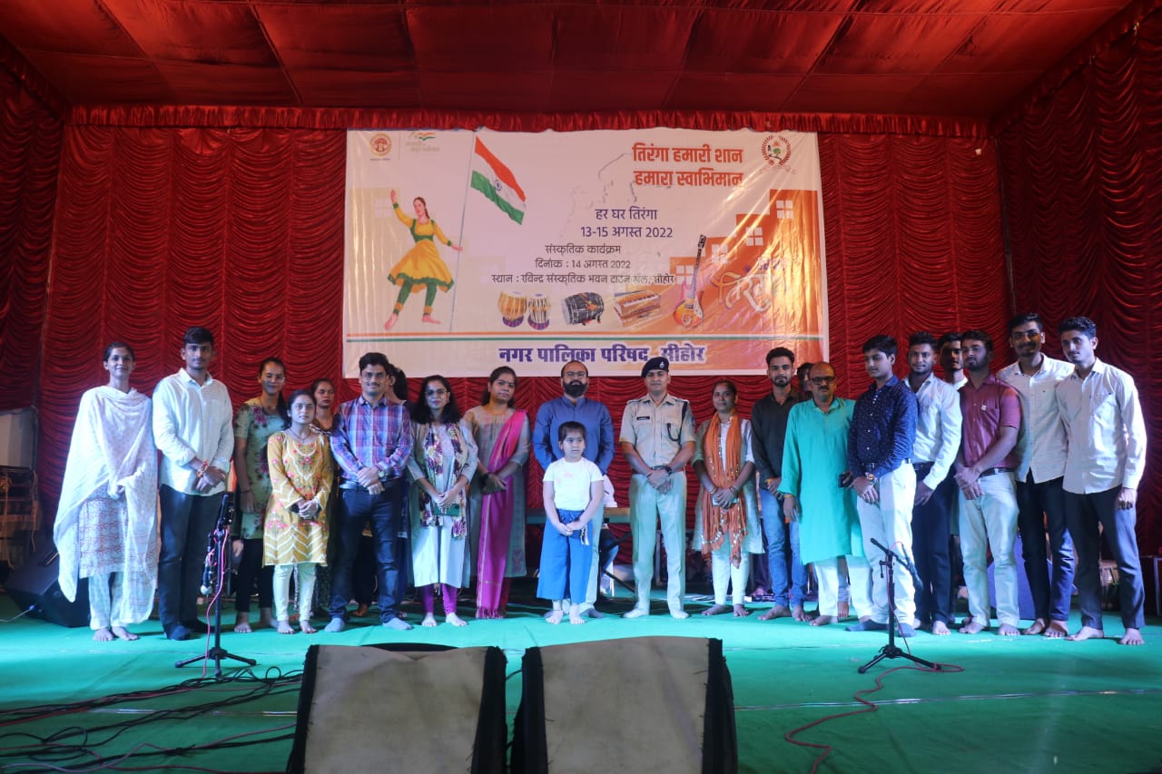 सीहोर। आजादी के 75वे अमृत महोत्सव पर 11 से 17 अगस्त तक हर घर तिरंगा अभियान चलाया जा रहा है। इस अभियान के तहत स्थानीय टाउन हाल में सांस्कृतिक कार्यक्रमों की संध्या आयोजित की गई। कार्यक्रम में सीहोर एवं होशंगाबाद के कलाकारों ने अपनी कला एवं देशभक्ति गीतों से सभी को देश भक्ति के रंग में रंग दिया। ऐ मेरे वतन के लोगों, अब तुम्हारे हवाले वतन साथियों, तेरी मिट्टी में मिलजावा सहित अनेक देशभक्ति गानों के माध्यम से कलाकारों ने सभी का ध्यान अपनी और आकर्षित किया। सांस्कृतिक कार्यक्रमों के पश्चात टाउन हॉल परिसर में आजादी की आतिशबाजी भी की गई। कार्यक्रम में कलेक्टर चंद्र मोहन ठाकुर, एसपी मयंक अवस्थी, जिला पंचायत सीईओ हर्ष सिंह, अपर कलेक्टर गुंचा सनोबर सहित अनेक अधिकारी एवं आम नागरिक उपस्थित थे।