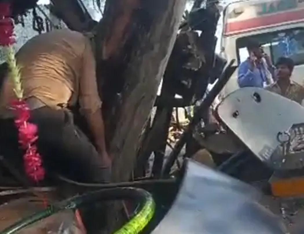 गाय को बचाने के प्रयास में पेड़ से टकराई बस