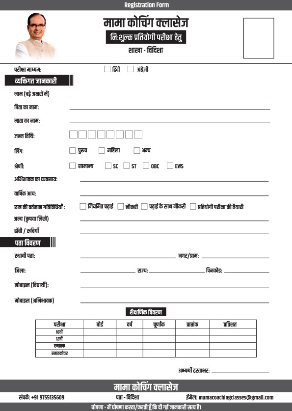 बता दें मामा कोचिंग क्लासेस का लाभ उठाने के लिए इच्छुक विद्यार्थियों को एक विस्तृत आवेदन फॉर्म भरना होगा। इस फॉर्म के माध्यम से छात्र की शैक्षणिक और पारिवारिक पृष्ठभूमि का आकलन किया जाएगा। फॉर्म में निम्नलिखित जानकारियां मांगी गई हैं, जिसमें…