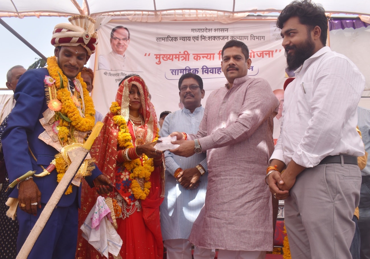 मुख्यमंत्री कन्या विवाह, निकाह योजना के तहत 21 मई को आयोजित विवाह समारोह में प्रति हितग्राही बेटी को 55 हजार रूपए के प्रावधान में 38 हजार रूपए की सामग्री एवं 11 हजार रूपए का चेक दिया गया। कार्यक्रम में नव दम्पत्तियों को प्रदेश सरकार की ओर से 32 इंच का एलईडी टीवी, एक टेबल फेन, 51 बर्तन, पलंग बिस्तर, दुल्हन के कपड़े, श्रृंगार का सामान और चांदी के आभूषण सामान दिया।